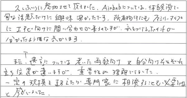 | ■旬な話題、Aiebnbの気を付けるポイントが分かった!(新宿区 M.H 様) 久しぶりに参加させて頂きました。 Airbnbについては、体験談で旬な話題だけに興味深かったです。 所有物件にもファミリータイプにエアビ向けに問い合わせが来るのですが、 気をつけるポイントが分かったような気がします。 また「遺言」については、 老いた両親向け又自分向けにそれぞれ立ち位置が違いますが、重要性が理解できました。 一定の規模を超えたら専門家に相談することも必要だと感じました。